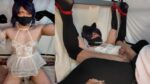 naked slave pig exposed in penis cage outdoor, tied up at testicles, jumps around, BDSM CBT