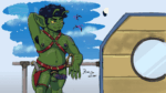 Retro Sci Fi goblin boy chilling on an airship, thoughts?~ (Art by @rommdan.bsky.social)